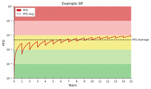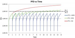 This effect is demonstrated in the following chart showing the typical sawtooth curve based on regular proof testing. The green curve with CPT set at a realistic value of 85% shows the PFD increasing over time, until after 15 years it exceeds the threshold between SIL 2 and SIL 1: in other words the SIL ‘degrades’ from a planned SIL-2 to a non-conforming SIL-1 function.