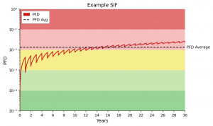 ExSILentia allows definition of varying MT for sensor, logic solver and final elements. In the example below, the MT for each component is assumed the same as their useful life, resulting in SIL-2 with RRF = 116 for a 30-year MT for the complete SIF. The downwards step-change in the ‘saw-tooth’ curve every 10 years reflects the ‘reset’ of the PFD-contribution of the valve/actuator: the ‘final element’ is often the largest contributory factor to SIF reliability, and focusing on this component generally gives the largest improvement in PFD.